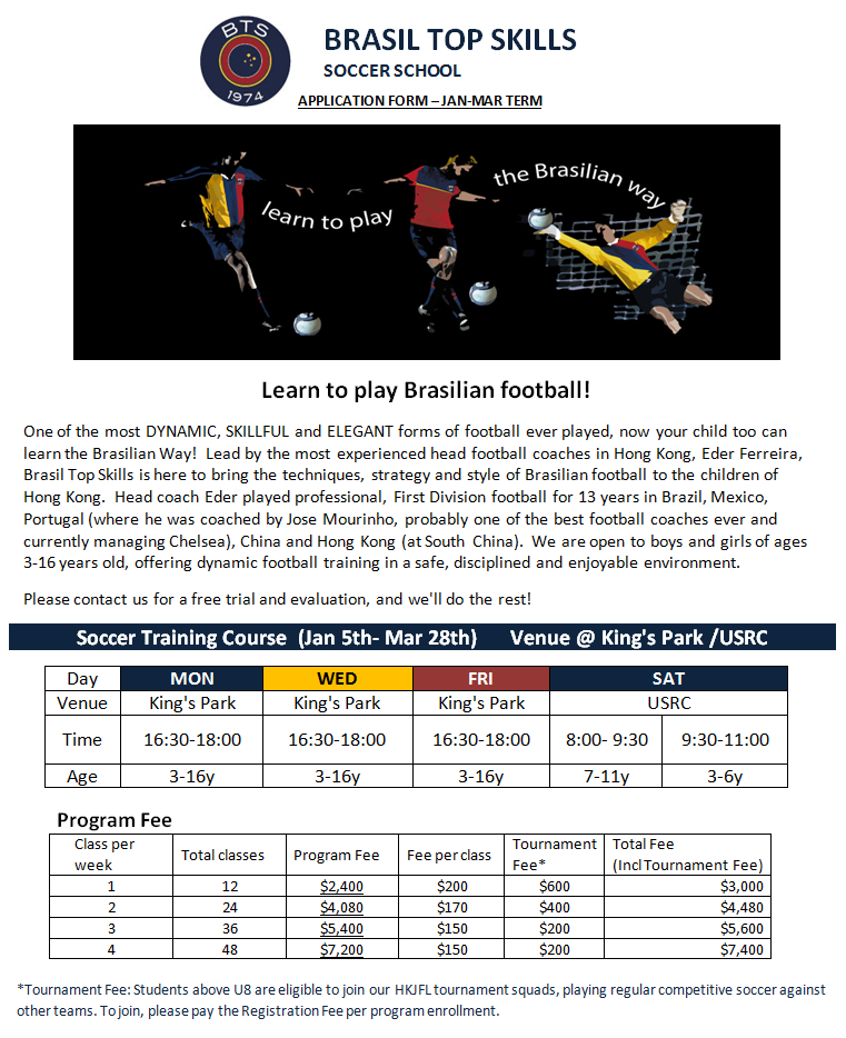BREAKING NEWS: Brasil Top Skills is now in Tung Chung.Passionate about football? Looking to improve your skills? Learn the right way to play the beautiful game … the Brasilian way.